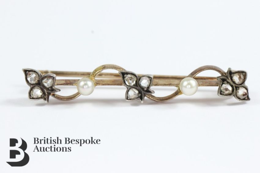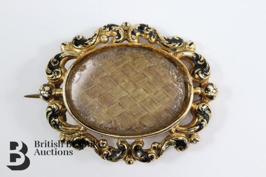 Victorian black and white enamel mourning brooch, engraved Stella Hope Campbell 6th January 1860 to January 1861, approx 35 x 30 together with a 9 ct diamond and pearl bar brooch set with approx 15 pts of rose-cut dias approx 34 mm and a 9ct gold amethyst bar brooch approx 65 cms, gross weight 14.14 gms.