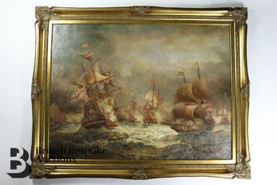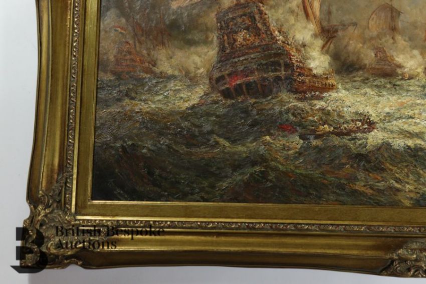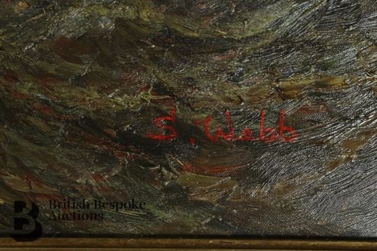20th century oil on canvas, view of a naval battle, signed in the lower right corner S.Webb, retailed by Bright's of Nettlebed, approx 120 x 95 cms, presented in an ornate frame.