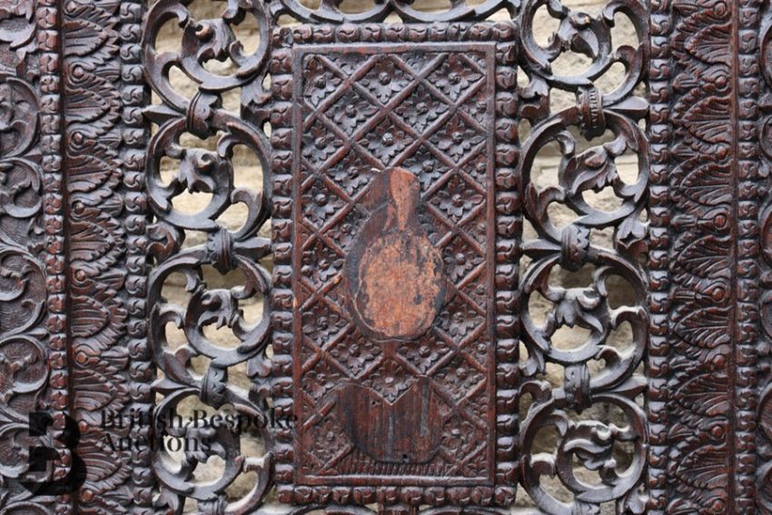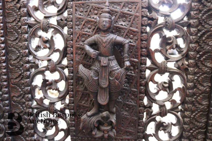 South Asian stained teak five panel room screen, finely carved with pierced decoration, with dancing figures carved in relief, each panel measures approx 56 cms, total length 280 cms in length, approx 250 h cms.