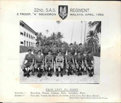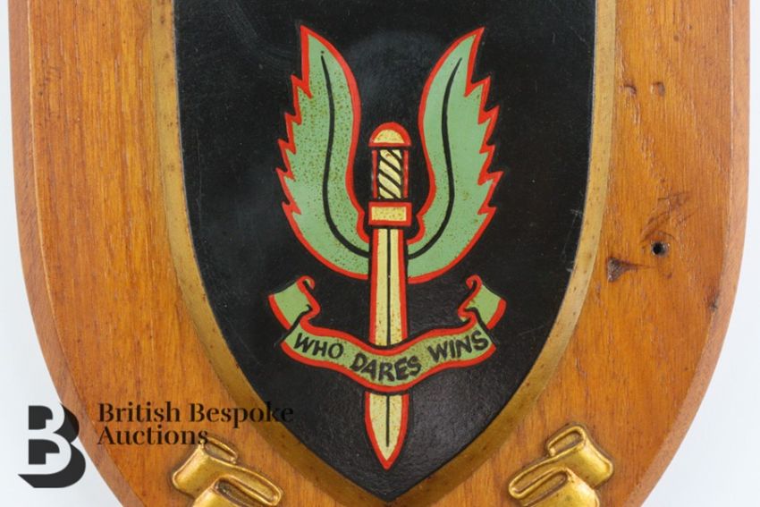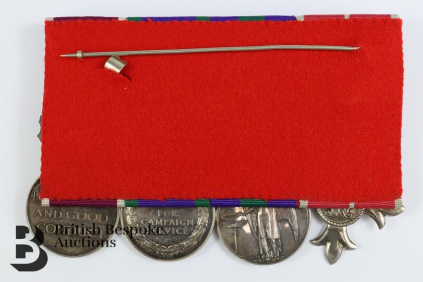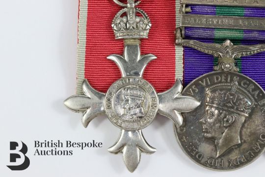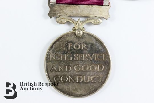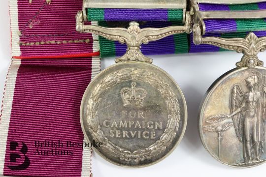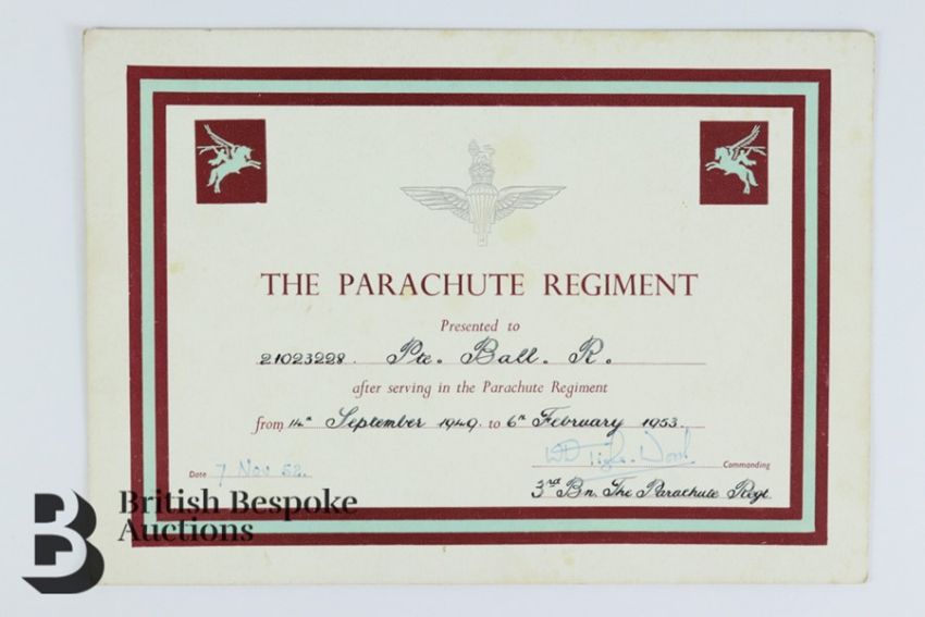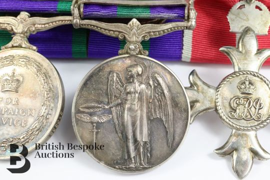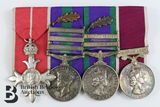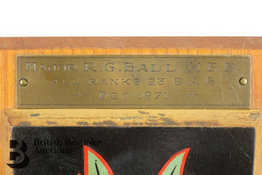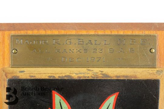 Group of medals awarded to Major Royston George Ball MBE 1st Kings Royal Rifle Corps, The Parachute Regiment and later 22nd SAS Regiment. The recipient served his country in various theatres and actions in the 1950's and 60's, primarily in the Middle East and South East Asia. This group includes a George VI GSM with Arabian Peninsula, Malaya and Palestine campaign clasps with oak leaf (mentioned in despatches 1956), inscribed 21023228 Rfn. R.G. Ball K.R.R.C. Queen Elizabeth II GSM South Arabia and Borneo clasp with oak leaf  (mentioned in despatches1966) inscribed to 21023228 W.O Cl. 2 R.G.Ball SAS and a Queen Elizabeth II Long Service and Good Conduct medal inscribed Lt. RG Ball Gen List. Included with this lot is Major Royston Balls' lot Regular Army Certificate of Service booklet stating "Mr Ball is a man of considerable personality and character. His active service experiences coupled with important administrative responsibilities have played a large part in moulding his character. He has shown himself capable and reliable at all times". 29th February 1968 Lt Col. Commanding Officer 21st SAS Regiment. Furthermore this booklet includes assessment of military conduct stated as being 'exemplary' and continues with a Parachute Regiment certificate dated 7th November 1952 and an SAS plaque engraved Major R.G Ball MBE All Ranks 23rd SAS December 1971, together with his original SAS beret with cloth cap badge. Twelve black and white photographs have been added to the images please note photocopied images will be available with this lot not the originals.  Condition report: campaign service medal ribbon bar is detached from the medal.