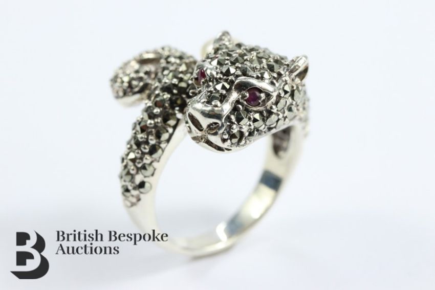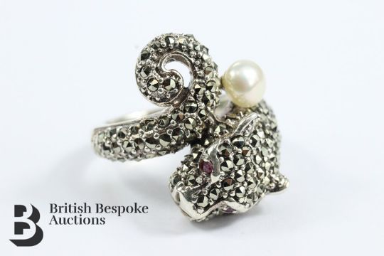 Unusual silver and pearl ring, depicting a panther with ruby eyes, size N, approx 8.27 gms.