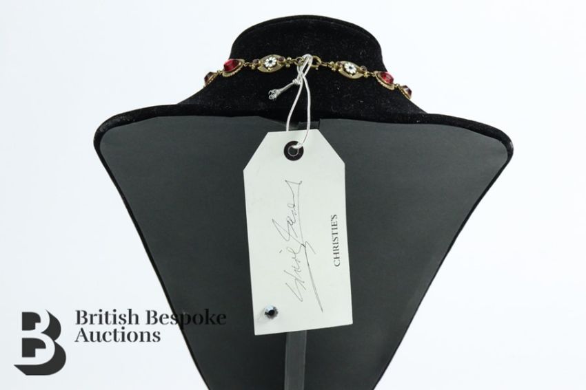 Dame Shirley Bassey Swarovski necklace. This necklace was previously owned by Dame Shirley Bassey and sold at Christie's in September 2003 as part of their Dame Shirley Bassey: 50 years of glittering gowns charity auction in association with Swarovski. The large red gems are Swarovski crystals, with two citrine stones, two amethyst stones and individual beads are garnet stones. The necklace is further heightened by enamel flowers, approx 44 cms in length. This necklace includes the original auction sales certificate for Christie's.