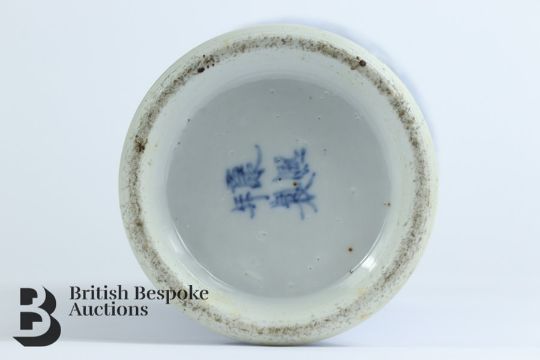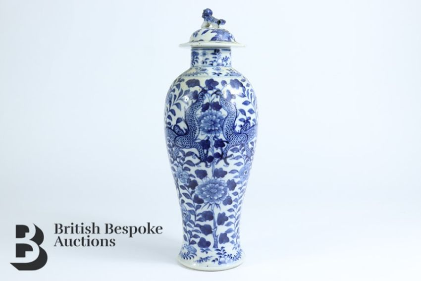Chinese 19th century blue and white baluster vase and cover, painted with chasing dragon amongst tree peony, Kangxi character marks to base, approx 32 cms h.