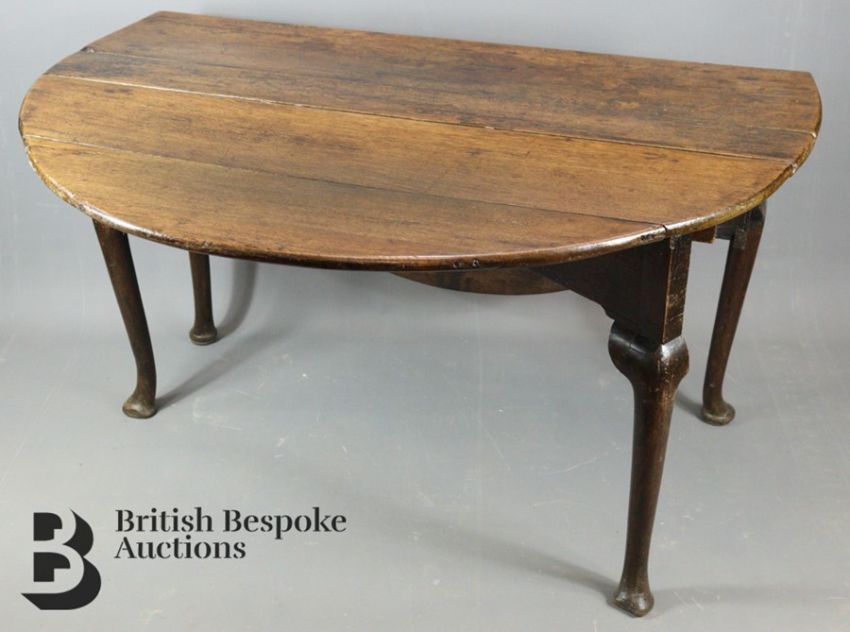 18th century oak drop leaf table, on pad feet, approx 131 x 42 x 72 h, each drop leaf measures 51 cms.