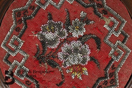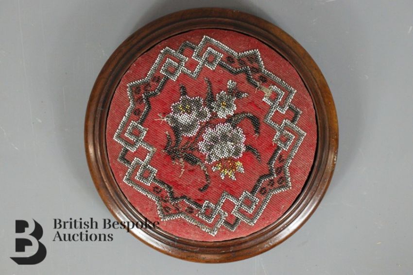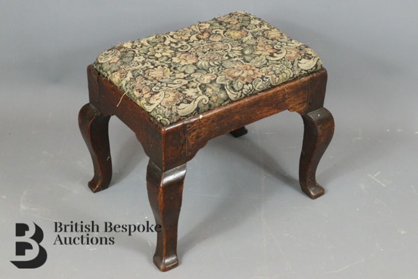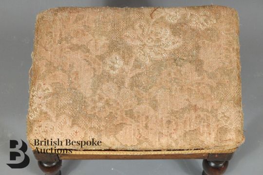 Trio of 18th and 19th century foot stools. The first example is 18th century oak upholstered with a foliate tapestry on splayed legs; the second example is oak with a pale pink upholstery and the third is a Victorian circular beaded example. (3)