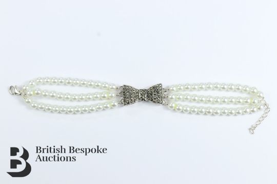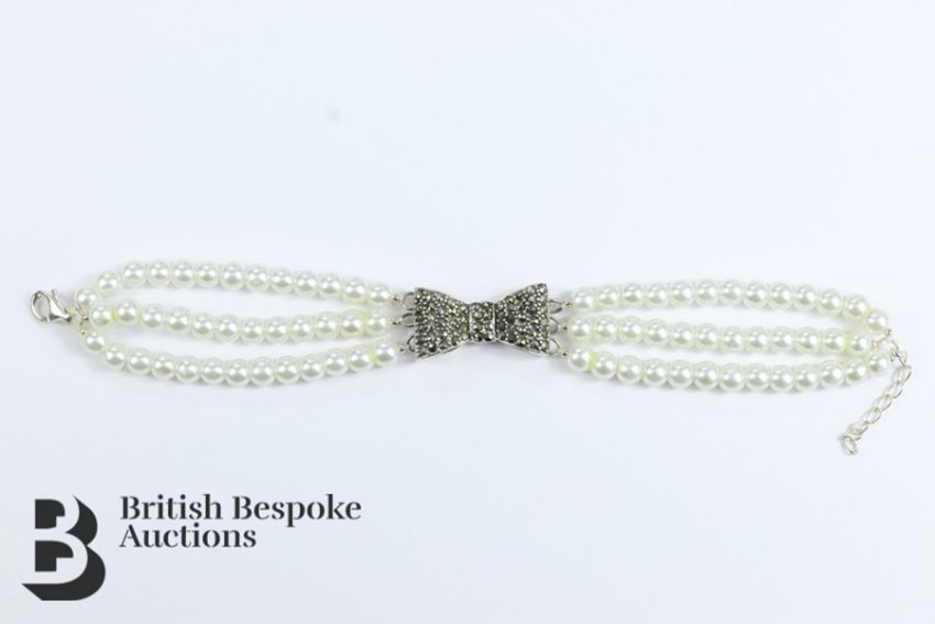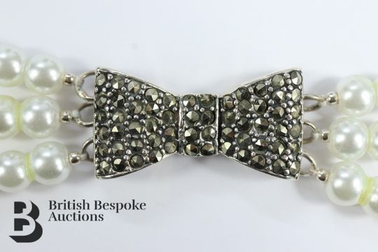 Triple row of freshwater pearl bracelet, set with a marcasite bow, approx 21 cms in length.