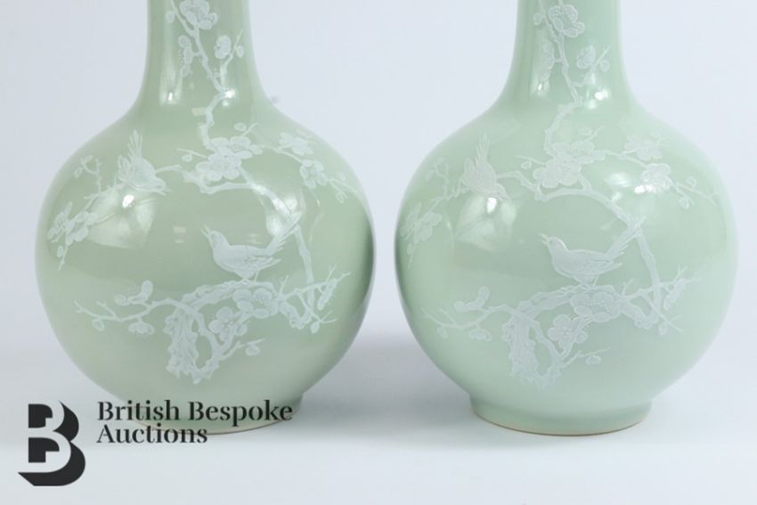 Pair of Chinese porcelain bottle vases, pale celadon ground enamelled in white with two birds seated on prunus branches, underglaze seal mark to base, approx 24.5 cms.