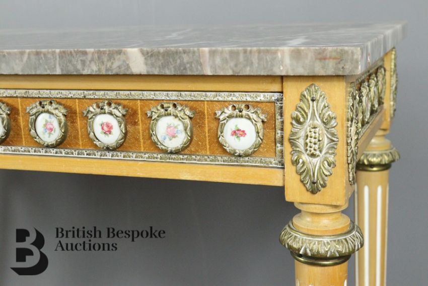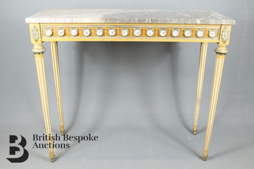 Satin wood console table, with oval porcelain plaque inserts, with white marble top, approx 33 x 90 x 77 cms.