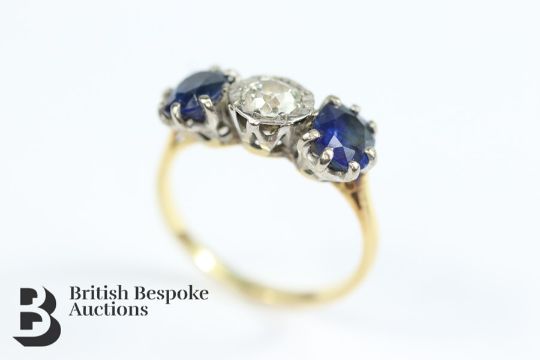 Antique 18ct yellow gold, sapphire and diamond ring. The ring set with an old-cut diamond approx 30 pts flanked by two royal blue sapphires approx 6 x 4 mm, size K, approx 2.84  gms.