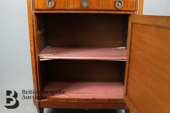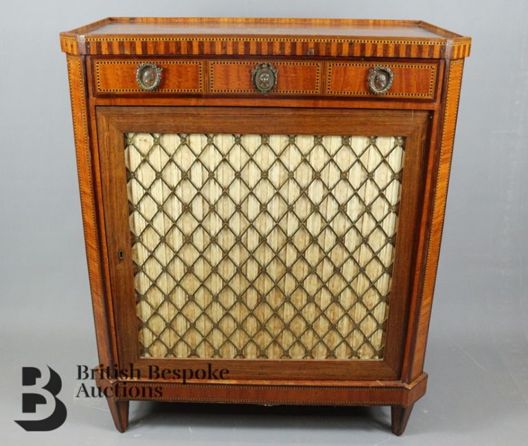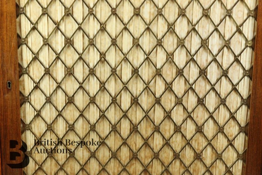 Edwardian cabinet, grilled front door opens to reveal a shelved interior, galleried top has decorative inlay with shell motif, approx 75 w x 40 d x 92 cms h.