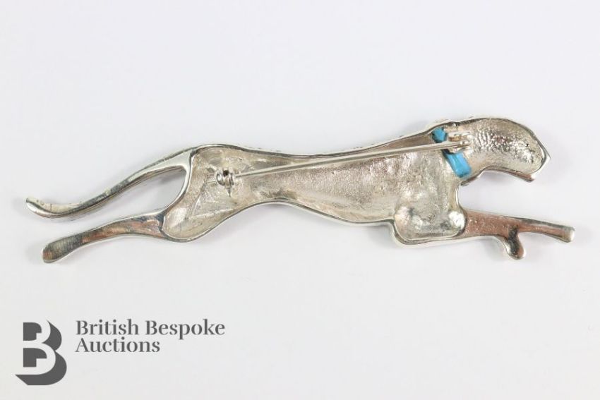 A silver sprinting leopard brooch, set with marcasite's & turquoise collar, approx 95 mm, great fun on a beret.