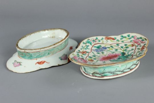 Two Chinese Famile Rose footed dishes; the dishes decorated with flowers, approx 20 x 14 x 3.5 cms. (2)