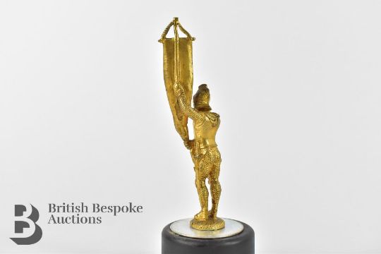 Three accessory mascots to include a greyhound jumping through a hoop approx. l 5cms, a plated Johnny Walker whiskey advertising mascot approx. h 8.5cms, and a crusader knight clutching a pennant flag on a flag post approx.18.5cms. (3)