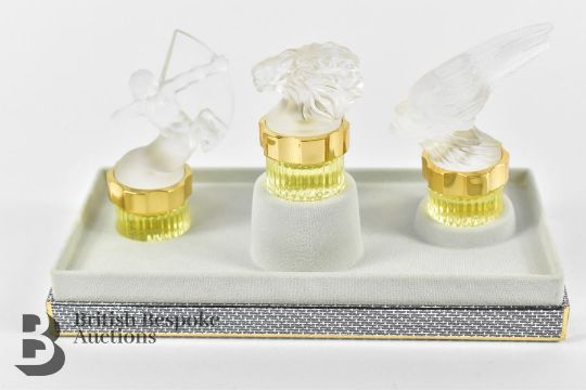 Lalique set of three Lalique, Lucite Miniatures Mascots, 'Les Mascottes Miniatures' pour homme eau de parfum 5ml, comprising Lion 1998, Sagittaire 1999 and Pheonix 2000. Issued by Lalique and sold in Harrods, Lalique labels to bases, accompanying Lalique paperwork in the original sales box and outer sleeve.