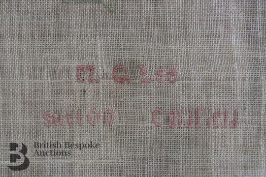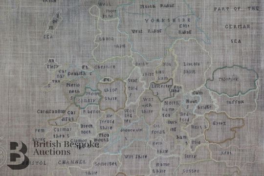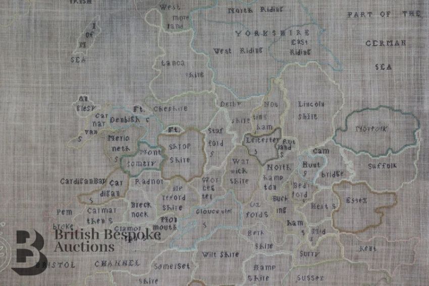 A rare map sampler made to teach writing, needlework and basic geography of counties of England, c1780-1820. This example was made by M. G. Lee of Sutton Coldfield. The map has grid references for longitude and latitude. Usually cross stitch and rectangular as they were made to put on display and were made with silk thread on linen. Approx. h59cm x w54cm.