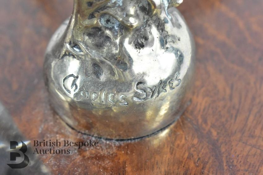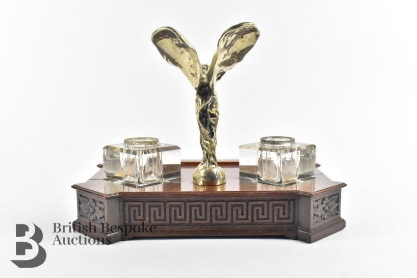 Rolls Royce Silver Ghost ink-stand. The ink-stand features a Rolls Royce silver ghost car mascot. The mascot is for the late model silver ghost (1918-1925) known as the solid base silver ghost. The mascot is similar to the Phantom II but larger in the base, it is about mid-size in height between the Phantom II and the earlier hollow base silver ghost. Cast in solid nickel silver with good detail and light patina, the mascot is signed to the base Charles Sykes and RR Ltd 6-2-11, mounted on an impressive burr wood stand but could easily be removed for use on a silver ghost,
