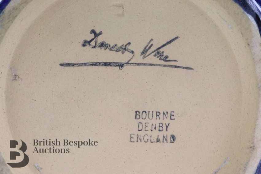 Bourne Denby electric blue pottery, circa 1930's including a twin-handled 'Elton' vase approx 25 cms h, Birchover pitcher approx 24 cms h and a tapering Crich pitcher approx 24 cms h. (3)Note: each piece in very good condition.