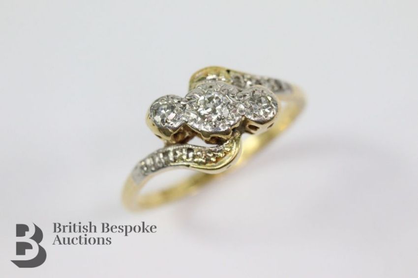 18ct and platinum three stone diamond ring. The ring set with one 7pt diamond and two 3.5 pt eight-cut diamonds, with approx 4 pts of smaller diamonds to mount, size P, approx 3.84 gms