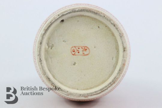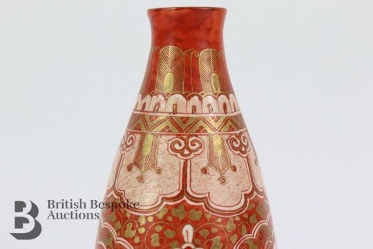 Late Meiji period Kutani sake bottle, iron red foliate and geometric design painted with domestic scenes approx 19.5 cms h.