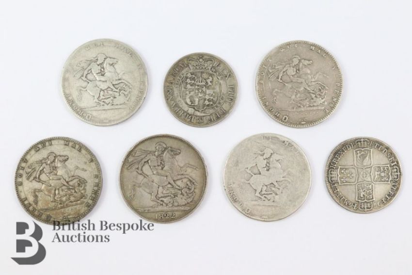 Georgian silver coins, including George II Lima coin 1746, George III shilling, George III crown 1822, two George III crown 1820, George III crown 1819, George III crown (poor condition).