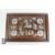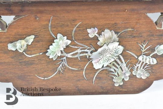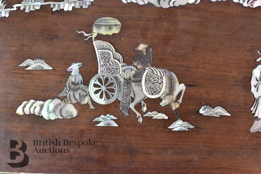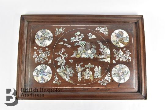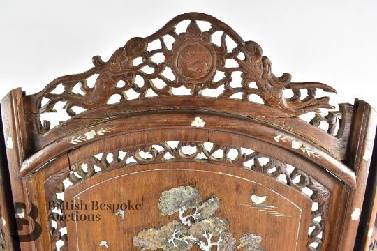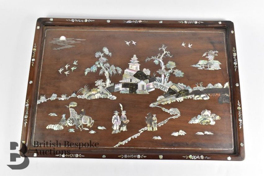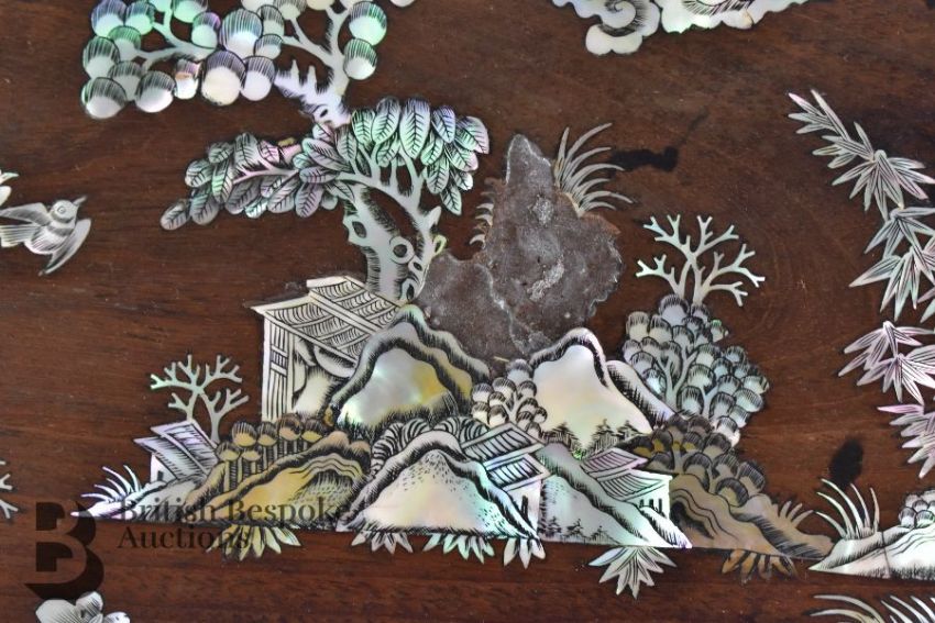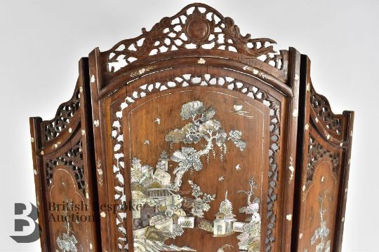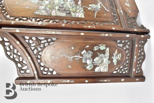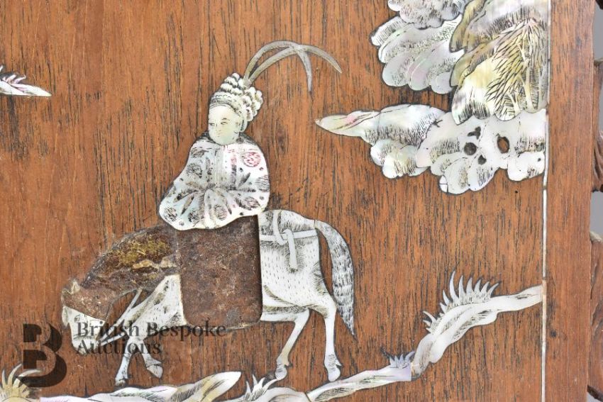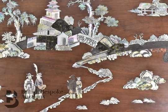 Note: the fretwork finial has broken from the top of panel screen but it is present for repair. Some areas of loss to the temple complex and to the figurine. There are several pieces missing to each tray but they are mostly present in an envelope which will be a good project.