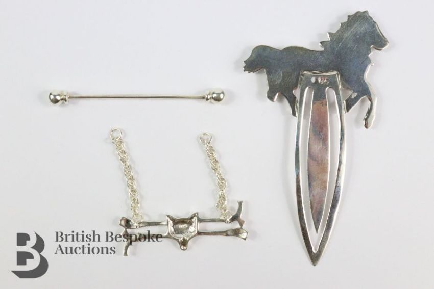 A silver bookmark with galloping horse finial approx 85mm or 8.5 cms together with a fox stock bar, approx 60 mm in width, approx 22 gms. (2)