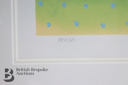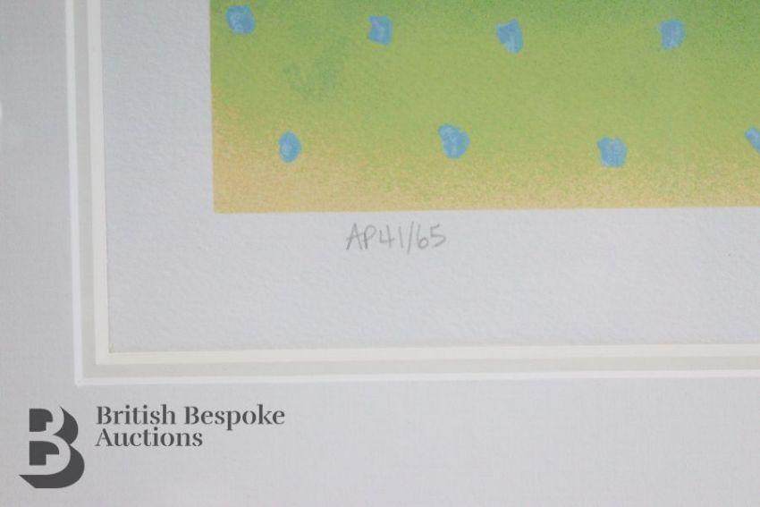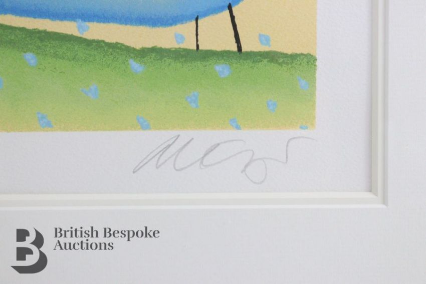 A large limited edition artist proof print of 'Three Sheep' by Mackenzie Thorpe, edition number A/P41 of 65 released Autumn 2000, with certificate of authenticity from Washington Green. Framed and glazed, approx. w112cm x h97cm.