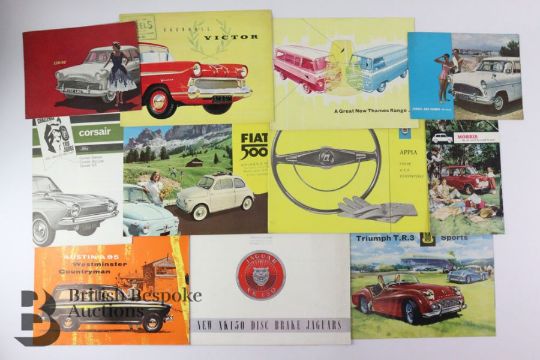 A quantity of vintage automobilia promotional brochures, including Austin Princess A135, Jaguar XK150, Lancia Flamina, Hillman Minx 1600, Panhard 24 Sports and price list, Renault Fregate x2 different, Austin Mini Countryman, Austin Mini Saloon, Austin Mini Cooper, Standard 10, Humber Hawk Supersnipe Imperial, Standard 8, Austin 4WD Gipsy, Austin Hire Car - Taxi, Ford Zodiac x2 different, Ford car price list from 1957, Ford Consul D/L, Austin Healey Sprite, Ford 3 Graces estate cars, Riley 2.6, Riley 1.5, Riley Motors, Renault Dauphine, Ford Zephyr x2, Ford Popular Prefect, Ford 105 Anglia, Sunbeam MKIII , Morgan cars 1958, BSA Instruction Manual for A7 Star, A7 Twin, A10 Golden Flash and A10 Super Rocket, MGA and MGA Accessories brochure, Skoda 440, MG colour chart, Standard and Triumph 1958 price lists, Humber Super Snipe x2 different, Humber Hawk, Thunderbird Ford 1957 LHD, Triumph TR3, Fiat 1100, Ford Squire, Ford Escort, Austin 95 Countryman, Standard Pennant, Corsair Saloon, Corsair D/L, Corsair GT, Fiat 500, Lancia Appia Range, Thames Van and Minibus range, Vauxhall Victor, Ford Zodiac Consul Zephyr, Hillman Husky, Ford Consul, Ford Consul D/L, Morris Mini, Vauxhall Velox and Cresta, Ford Popular, Wolseley Farina Stalion Lines, Ford Zodiac, Humber Snipe dimensions and price list, Singer Gazelle Range, Vauxhall Victor Series 2 with price list, Austin A35 Saloon, Simca Aronde P60 x2 different, Singer Gazelle, Ford Popular Marque magazine, and Singer Gazelle spiral bound data book for car salesmen. Approx. 65 brochures, in good clean condition.