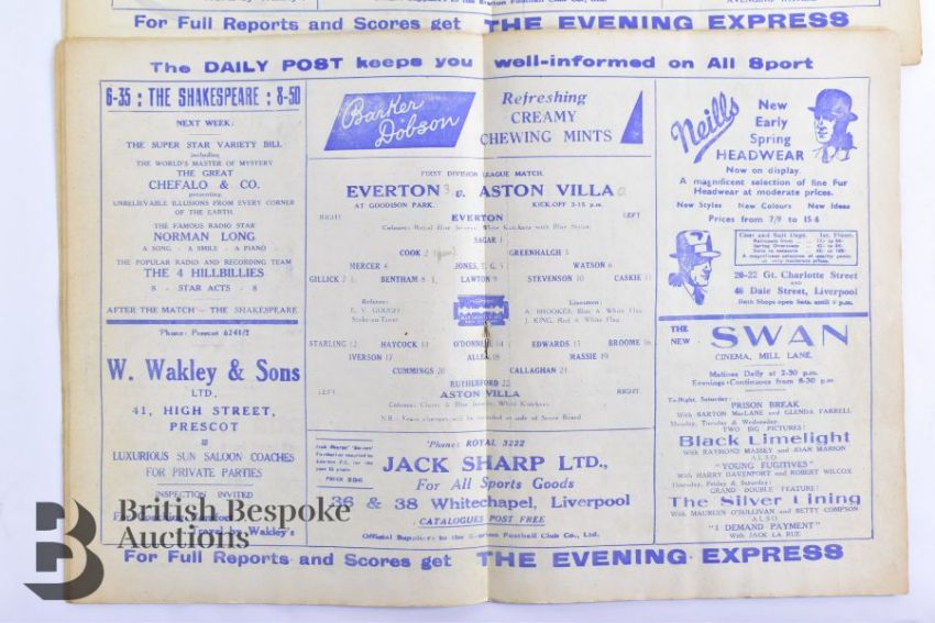 Two football programmes from 1939: Everton v Birmingham 18th March 1939 and Everton v Aston Villa the last game of the season where Everton had already won the title. Neat pencil scores, in good clean condition. (2)