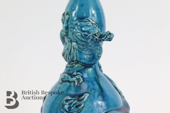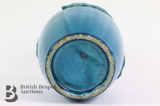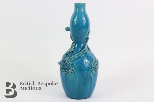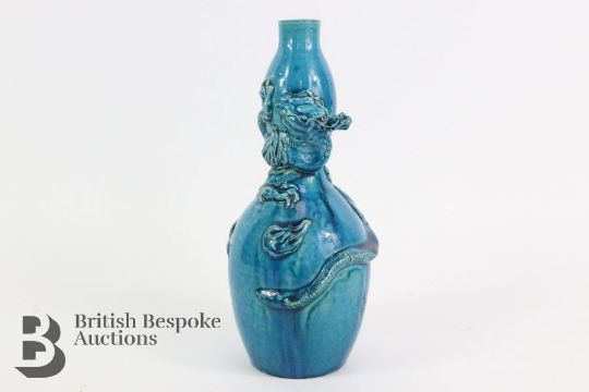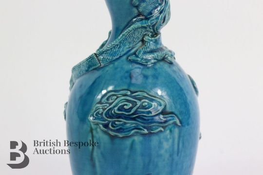 Chinese turquoise blue vase, decorated with a dragon chasing flaming pearls of wisdom in relief, approx 24 cms.