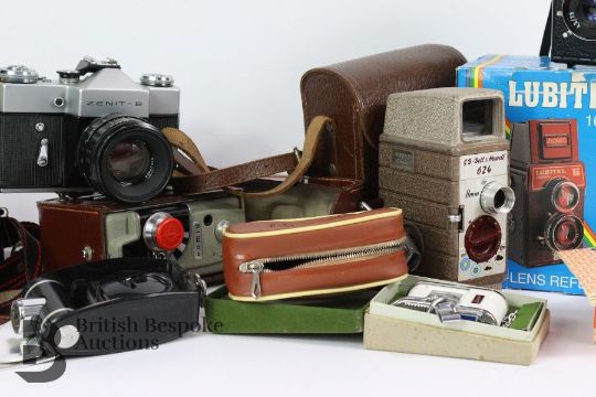 Vintage cameras, including a Lubitel 166U Made in USSR camera in the original box with instructions, a G.B Bell and Howell 624 8mm in original case, Eumig Electric camera made in Austria in original case, Zenit-B camera with Helios 44-2 lens made in USSR and Wallace Heaton Zodel-G 1:4.5/240mm lens, and a Nikaiyo FMD camera and Soligor MK-2S flash. Together with a camera accessories including a Agfalux flash in original case and Agfa Lucimat light meter in the original box, a Sixon light meter in the original box. (9)