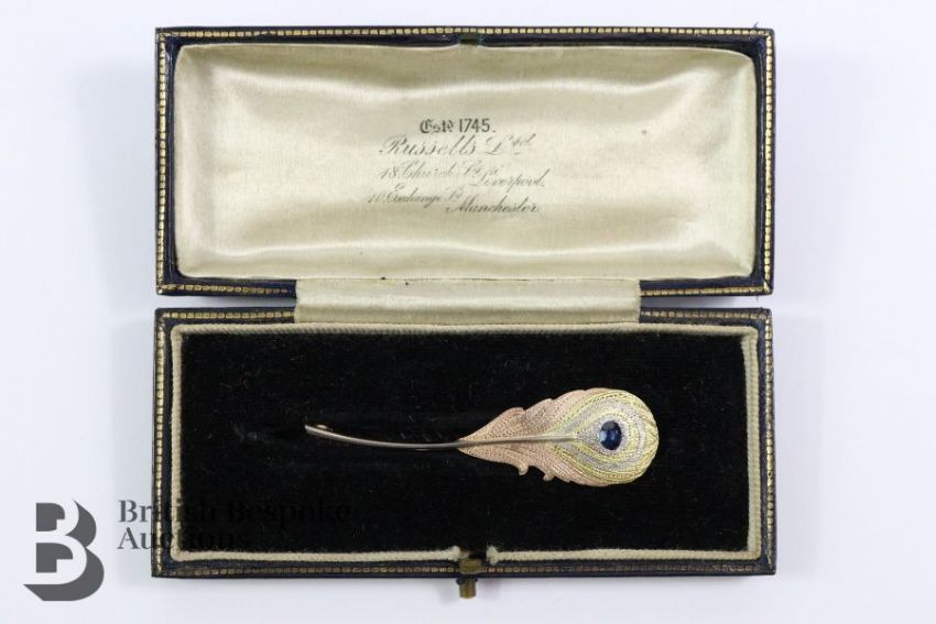 15ct/18ct gold (testing) sapphire peacock feather brooch. The brooch set with a sapphire approx 5 x 3.4 mm, the total length is 5.8 cms.