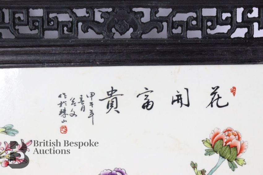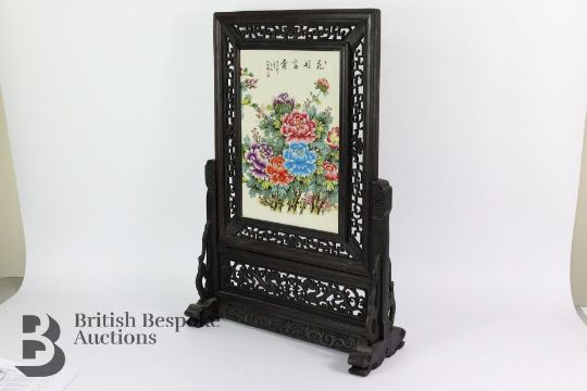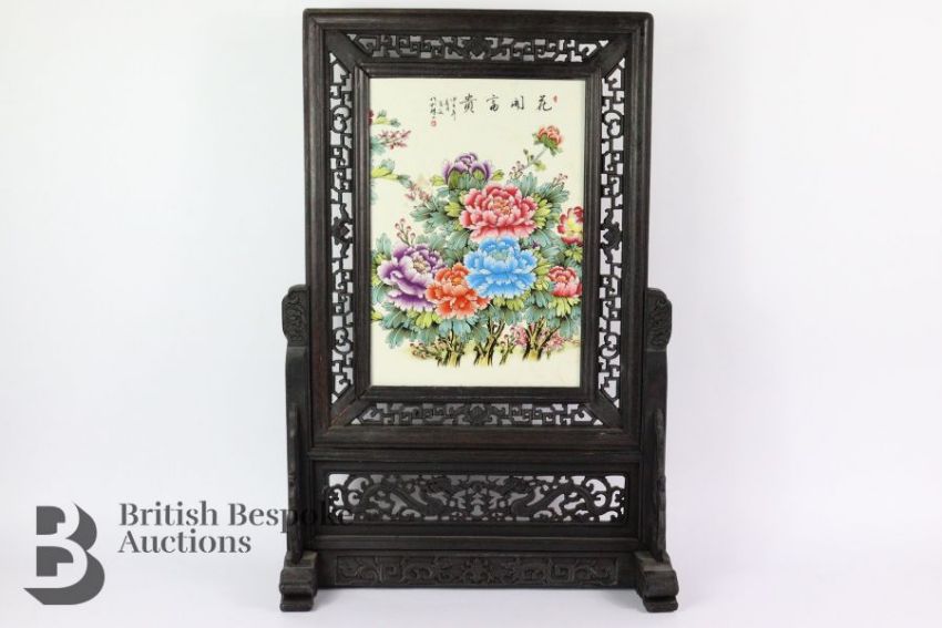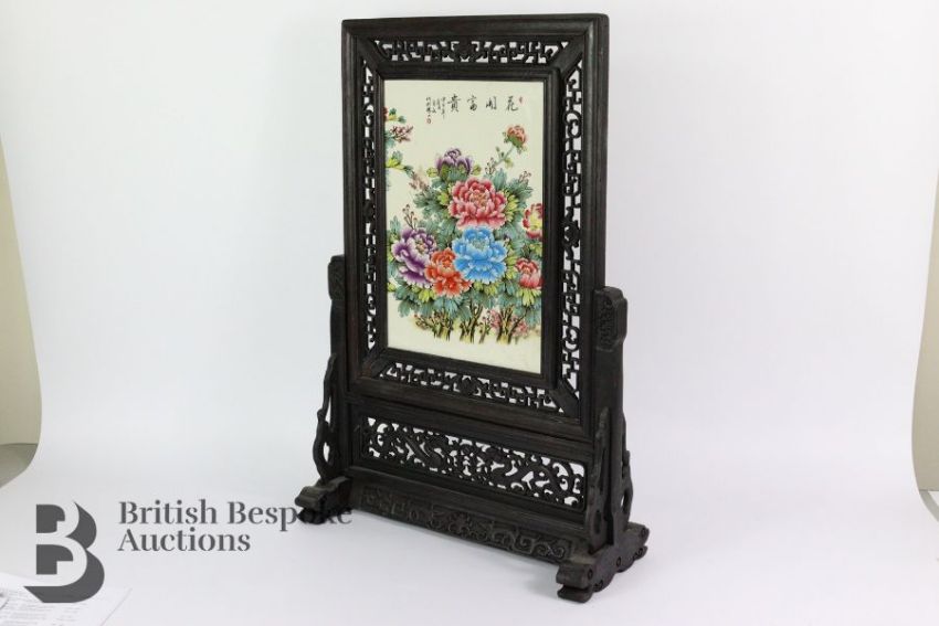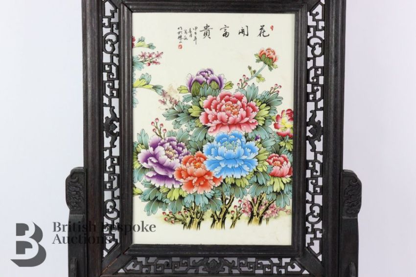 A modern hardwood framed table screen with ceramic panel, 68 x 40 cms, depicting chrysanthemum.
