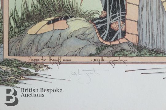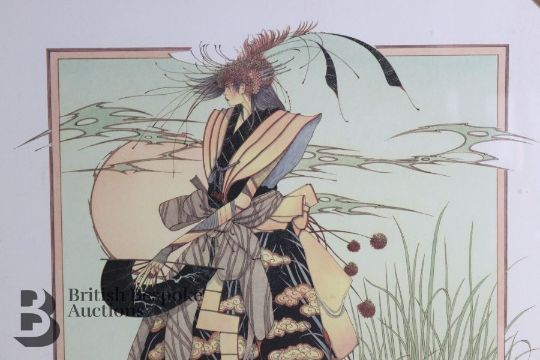 Graham Illingworth (British b.1853) limited edition prints entitled 'Pause for Thought' 309/850 and 'Nemesis comes to sweep away the past...'306/850 with gallery blind stamp, approx 48 w x 55 h cms each, both pencil signed and numbered in the margin, framed and glazed. This lot includes two more limited edition prints depicting Samurai profiles nr 19/850 and 19/850, both pencil signed and numbered in the margin, framed and glazed. (4)