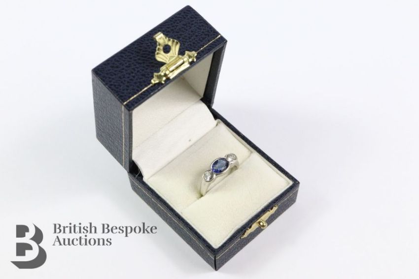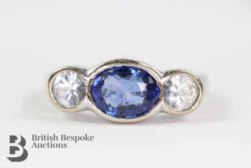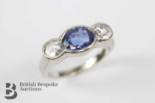 Bespoke 14/15ct white gold Ceylonese sapphire and diamond ring. The sapphire measures 7 x 5.5 mm, surrounded by white spinel/zircon, size I, approx 3.75 gms.