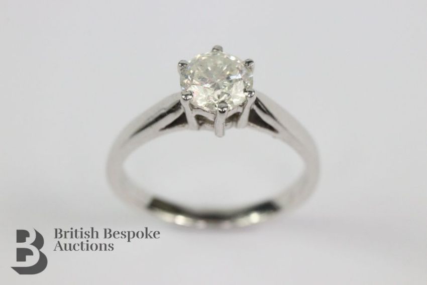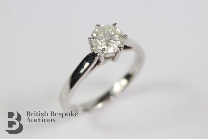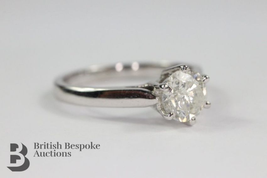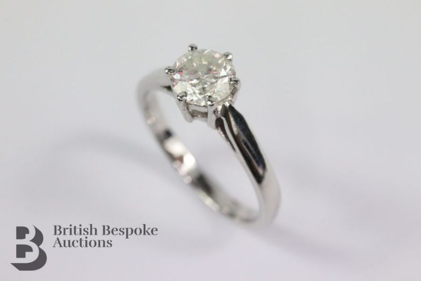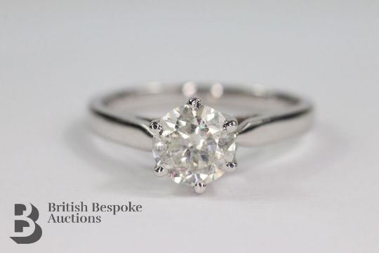 An 18ct white gold single stone brilliant-cut diamond ring. The diamond of approx 70 points, size K+,