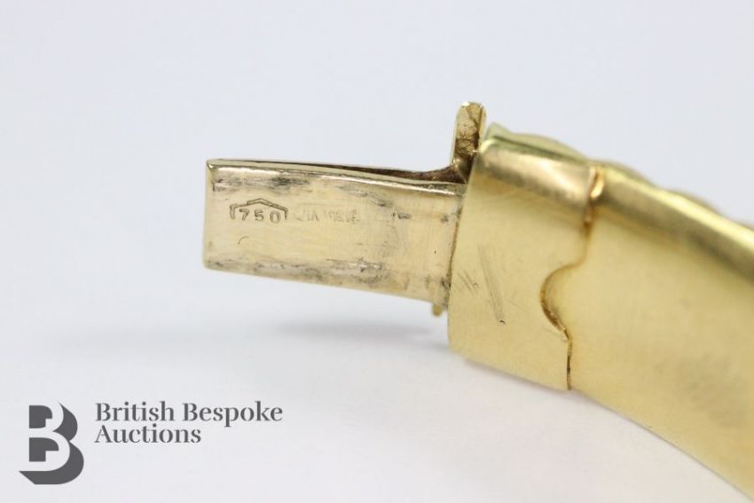 18ct yellow gold bangle, stamped 750, measures 60 x 50 mm, 30.3 gms.