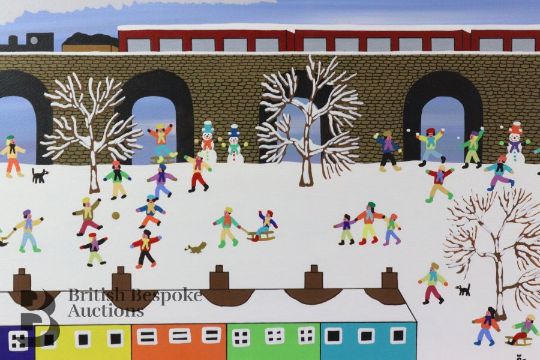 An original painting by Gordon Barker (contemporary Devon artist) entitled 'Out in the Snow', acrylic on acid free paper, framed and glazed approx. h35 x w 45cm, signed by the artist.