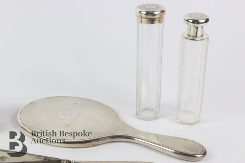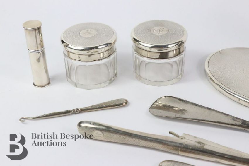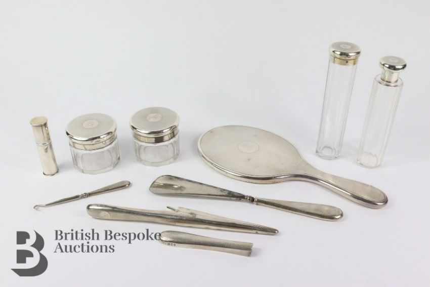Silver and cut-glass vanity set, each piece having a engine-turned top London hallmark dated 1900/1901, comprising two long jars, two short jars, one hand mirror, pair of glove stretchers (af), shoe horn, button hook and a separate silver scent dispenser.
