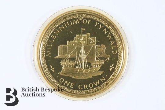 Pobjoy Mint Limited Edition of 300 Isle of Man 22ct gold proof millennium crown set 1979, in the red velvet presentation box with certificate. Together with a Pobjoy Mint Limited assurance purchase-back guarantee letter.