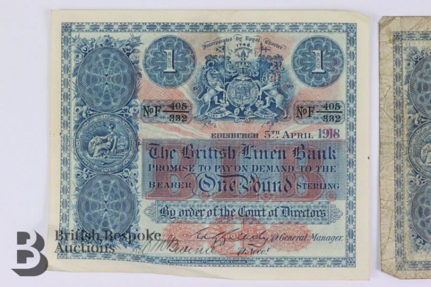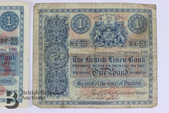 Scotland, British Linen Bank, 1914 One Pound note 23rd September 1914 NoA374/127 (general creases and stains) and a later example 5th April 1918 No F405/332. (good condition).