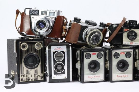 Quantity of vintage Kodak box cameras, including Kodak No 2 folding Cartridge Premo with case, Kodak 35 Kodex No1 with case, Kodak Brownie 127 with case, Kodak Six-20 Brownie camera with case, Prontor 500 LK Renitte 1B with case, Duaflex II boxed, Kodak Brownie Six-20 model D (rewind knop missing), Kodak Brownie Flash II, Brownie Flash III, Kodak Brownie Junior Six-16, all in reasonable condition. (10)