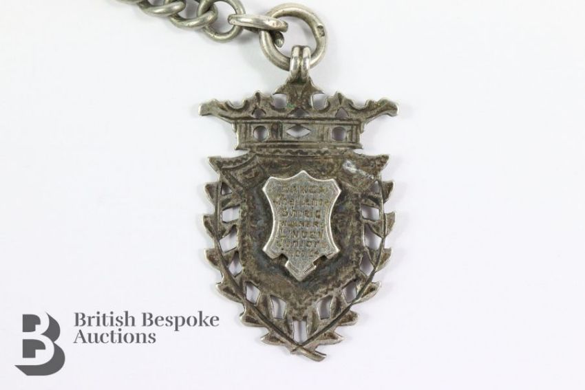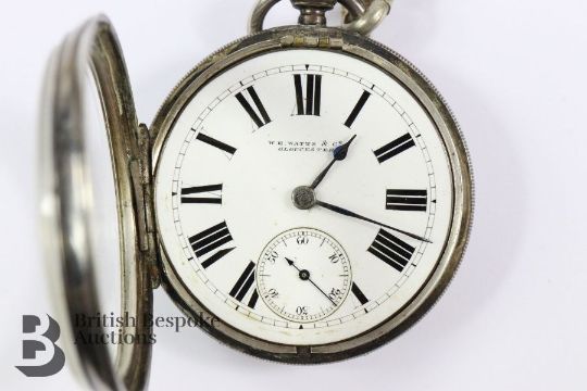 Watts & Co silver open face pocket watch. The watch having a white enamel face with Roman dial  and subsidiary second hand. The watch movement engraved Watts & Co 70 Southgate Street Gloucester nr 15872,London hallmark dated 1885, suspended from a white metal fob chain with a silver Baker Challenge Shield medallion.