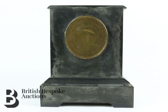 Slate and marble mantel clock with white enamel face and roman dial, retailed by Albion Snell 129 Tottenham Court Road, complete with pendulum and key, measures approx. h 28cm x w 26cm.