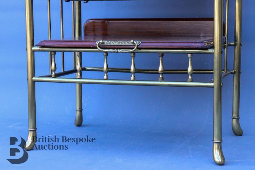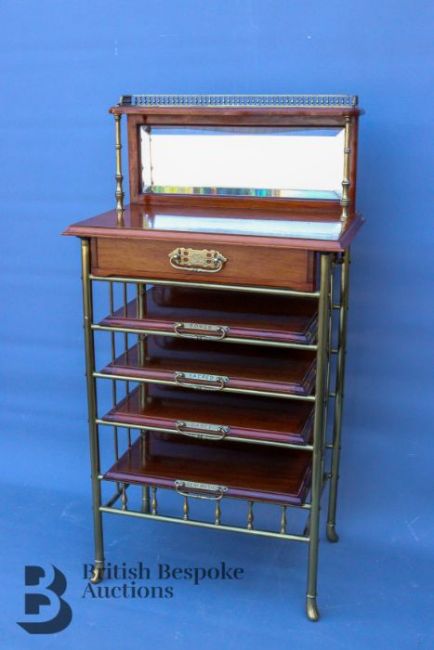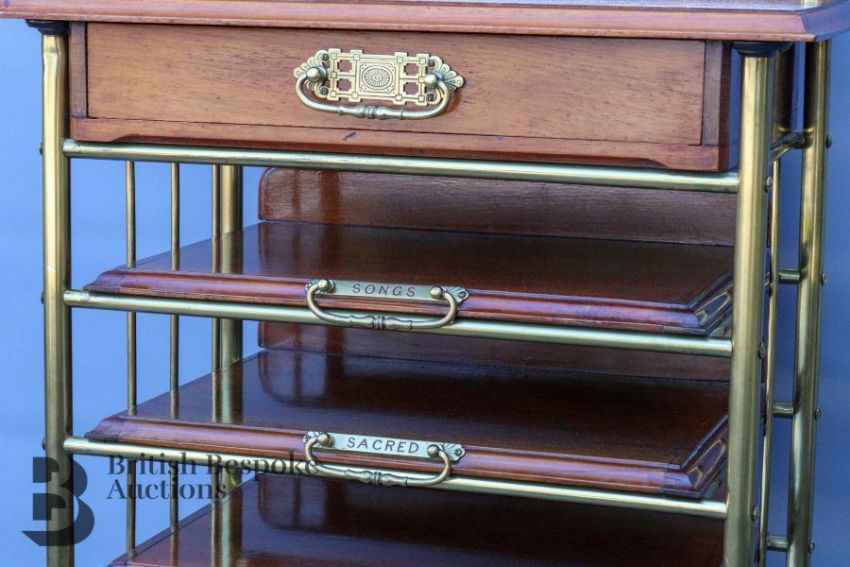 Victorian sheet music cabinet. The brass frame having four mahogany sliding shelves below a single drawer. The whole surmounted by brass column supports, bevelled mirror and shaped gallery with fine brass balustrade, English circa 1870-1890, approx 104 x 56 x 35 cms.