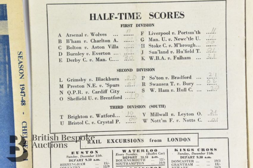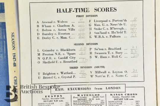 12 Chelsea football programmes from 1947 to 1953, includes Chelsea v Portsmouth 13th Dec 1947, Chelsea v Liverpool 28th February 1948, Chelsea v Charlton Athletic 13th March 1948 x2, Chelsea v Blackpool 3rd December 1949, Chelsea v Manchester United 10th September 1949, Chelsea v Everton 19th November 1949, England World Cup XI v F.A. Canadian Touring Team 20th September 1950 at Stamford Bridge , Chelsea v Derby County 25th November 1950, Chelsea v Newcastle United 12th March 1952, Chelsea v Burnley 7th March 1953. Some neat pencil scores otherwise in good clean condition.