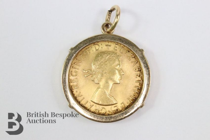 Queen Elizabeth II full sovereign pendant dated 1964, presented in a 9ct gold mount, 10.8 gms.