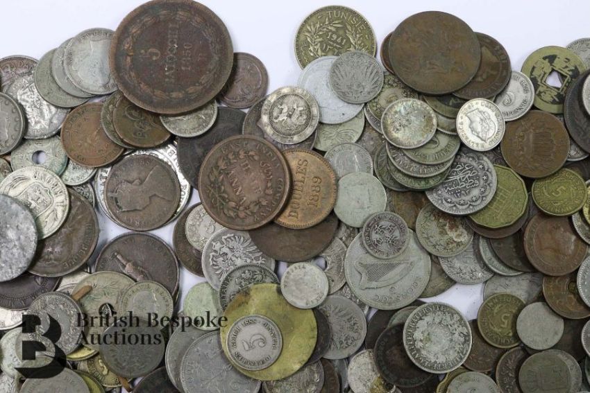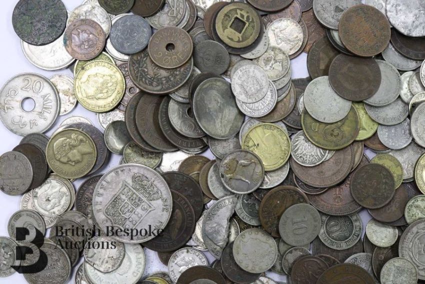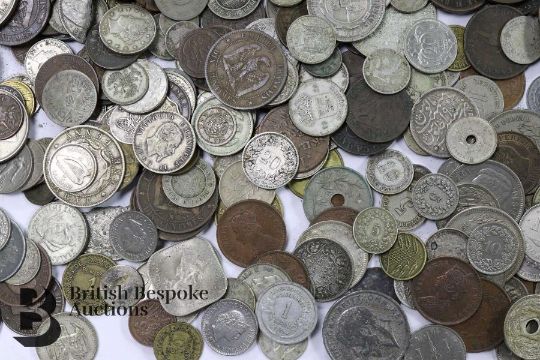 Large quantity of miscellaneous UK and foreign coins contained in a cash box, including USA, New Zealand, France, Portugal, Gibraltar, Canada, Palestine, German, Austrian, Corsican, Italian, South African Kruger shilling, Guernsey, Spain, some silver amongst it.