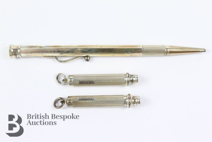 Silver Baker's Pointer propelling pencil, Birmingham hallmark, mm E. Baker & Sons, together with silver propelling pencils both Birmingham hallmark having engine turned decoration with suspension loops, approx 44.5 gms total. (3)