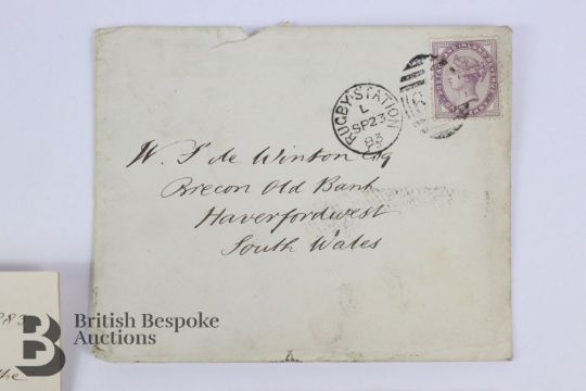 (1883/1886) two handwritten letters from Matt H. Bloxam to W S de Winton, the first in it's original envelope posted at Rugby Station and referring to a drawing by Mr Bloxham of the effigy at St Mary's Church Haverfordwest, the drawing being included in this lot. Matt H. Bloxam was an antiquary and famous as the person who attributed the founding of rugby football to Rugby School.